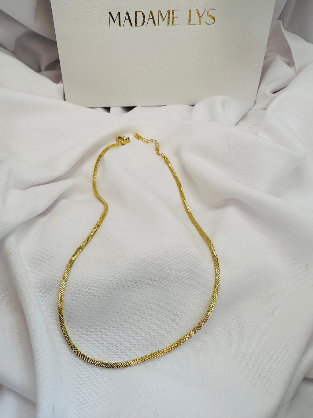 The Madame Lys Flat Chain Necklace shines with effortless elegance. Plated in 18k gold, its refined texture and fluid design bring a luxurious, sophisticated glow to any look.