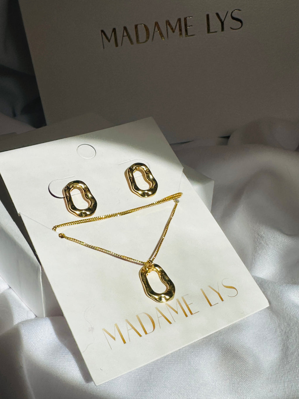 The Madame Lys Organic Set showcases modern elegance with fluid, natural shapes. Crafted with 18k gold plating, this refined necklace and earring duo radiates sophistication and artistic charm.