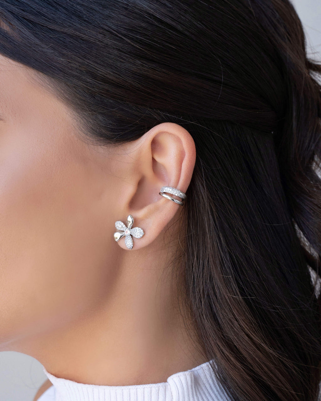 With a comfortable and secure fit, this piercing is ideal for the cartilage, allowing versatile combinations with hoop earrings, studs, and other crystal-accented pieces.
