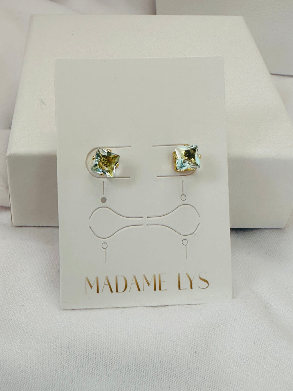 The Madame Lys Square Crystal Studs radiate timeless elegance and sophistication. Plated in 18k gold, their luminous square-cut crystals capture light beautifully — a refined touch for any occasion.